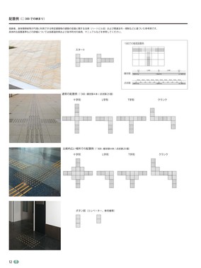 12高齢者、身体障害者等が円滑に利用できる特定建築物の建築の促進に関する法律(ハートビル法)および関連法令・規制などに基づいた参考例です。具体的な設置基準などの詳細については各都道府県および各市町村の条例、マニュアルなどを参照してください。 十字形L字形T字形クランク通常の配置例(□300:線状鋲4本/点状鋲25個)スタート十字形L字形T字形クランク比較的広い場所での配置例(□300:線状鋲4本/点状鋲25個)ボタン前(エレベーター、券売機等)配置例(□300での納まり)55510L240L2405□500タイル□500タイル□500タイル55.655.655.655.655.655.655.655.655.655.6□500タイル□500タイル□500タイル線状鋲□500での推奨設置例点状鋲