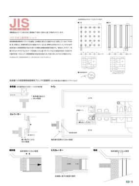13各設備への視覚障害者誘導用ブロックの設置例(2013年度国土交通省ガイドラインより)券売機点字運賃表及び点字シール付き券売機エレベーター傾斜路トイレエスカレーター階段券売機手前から30CM程度カウンター乗り場ボタン多機能トイレ女子用男子用点検蓋くし板乗り場ボタンから30CM程度触知案内図等から30CM程度触知案内図等始終端部から30CM程度点検蓋に接する程度の個所始終端部から30CM程度JIS規格製品の形状・寸法及びその配列●線鋲●点鋲掲載製品はすべてJIS(日本工業規格)T9251:2001に基づき製作されています。視覚障害者誘導用のブロックは道路、公共施設、駅などに施設され広く普及しているが、その形状、色、材質など、多種多様なものが施設されているため、標準化が求められていた。そのため平成8年度から視覚障害者の協力を得て大規模な被験者実験が実施され、認知のしやすさ、切替りのわかりやすさなどのデータを取得。これに基づきブロックなどの突起の形状・寸法及びその配列を統一することで、視覚障害者の安全性を図るため、平成13年にJIST9251が制定された。日本規格協会発行「視覚障害者誘導用ブロック等の突起の形状・寸法及びその配列」よりJIS(日本工業規格)についてAA'30以下DD'BBBC記号AA'BCDD'許容値+1.50 +1017A+10755270以上D+10寸 法ABA'BBBCBB記号AA'BC許容値+1.50 +1012A+1055∼60*5寸 法注*この寸法範囲でブロックなどの大きさに応じて一つの寸法を設定する。備考ブロックなどの継ぎ目部分(突起の長手方向)における突起と突起の上辺部での間隔は、30MM以下とする。単位MM単位MMRR2MM<=●突起断面図形状規格製品